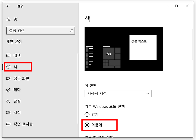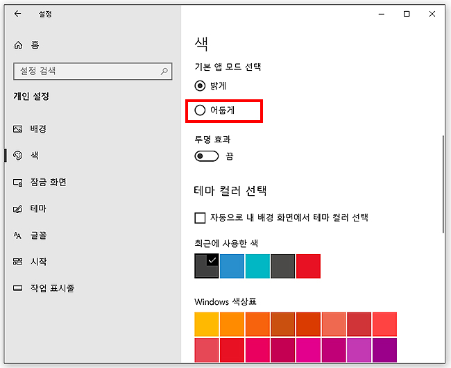 2) 왼쪽 '색' 메뉴를 선택해 주시고, '기본 Windows 모드 선택' 부분을 봐주세요.