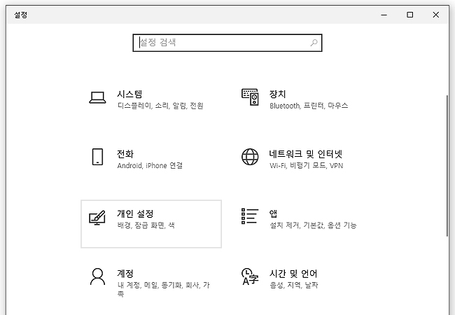 - 바탕 화면 마우스 오른쪽 키를 눌러 '개인 설정' 메뉴를 선택하면 '설정'창이 열립니다.